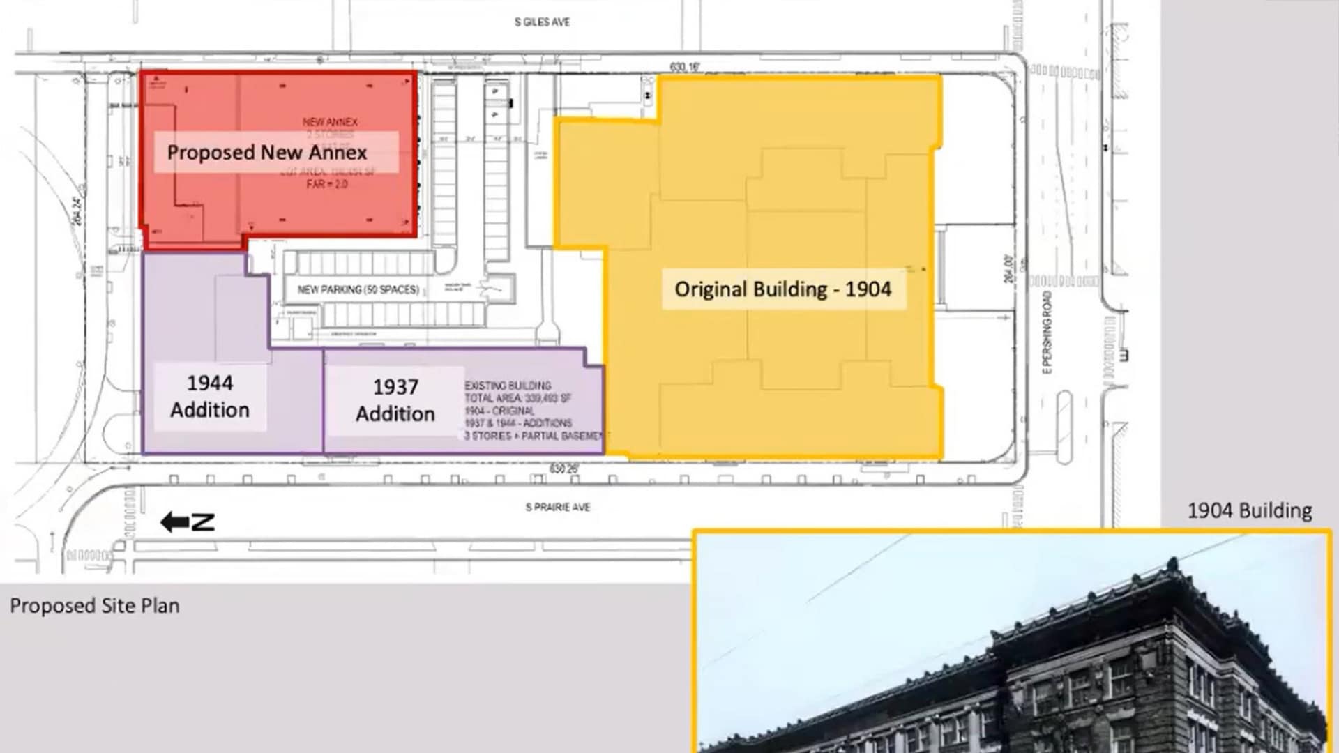 Construction permits have been issued for a new annex addition to the Wendell Phillips High School, located at 244 E Pershing Road in Bronzeville. Planned by the Public Building Commission of Chicago, the building will mainly serve as a new gymnasium, and will replace an existing surface parking lot on the northeast corner of the campus. The existing structures on the campus include a landmarked three-story brick building from 1904, as well as other two buildings built in 1937 and 1944.