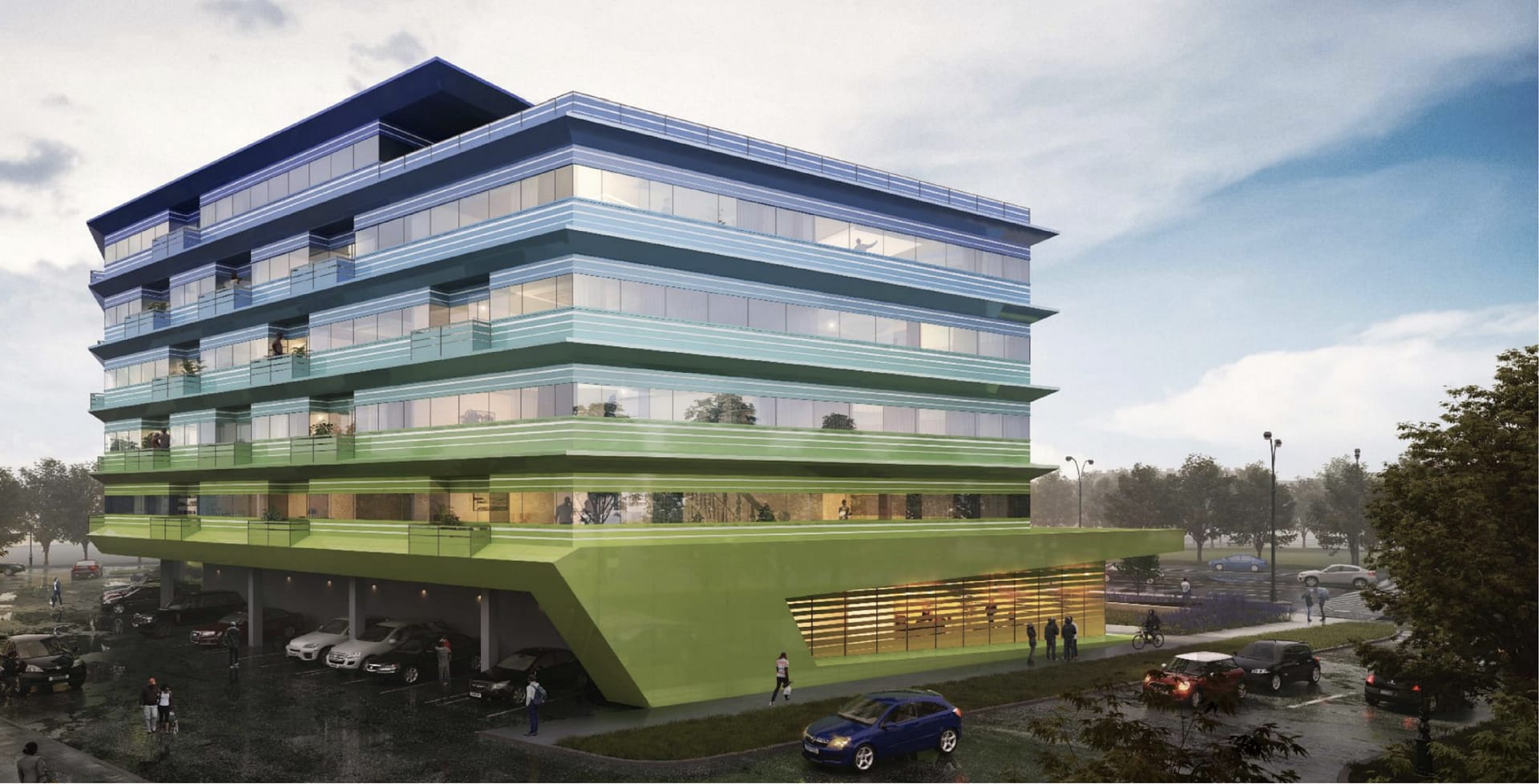 With a design from JGMA, the building is oriented to connect with the street at the edges, while folding back to create an open plaza along the streetscape. Creating relief along the urban edge, the exterior plaza welcomes people and residents to the building. Rising 72 feet, the building sets back further from the street above the ground floor, giving prominence to the ground floor while also giving space for balconies on the upper floors.